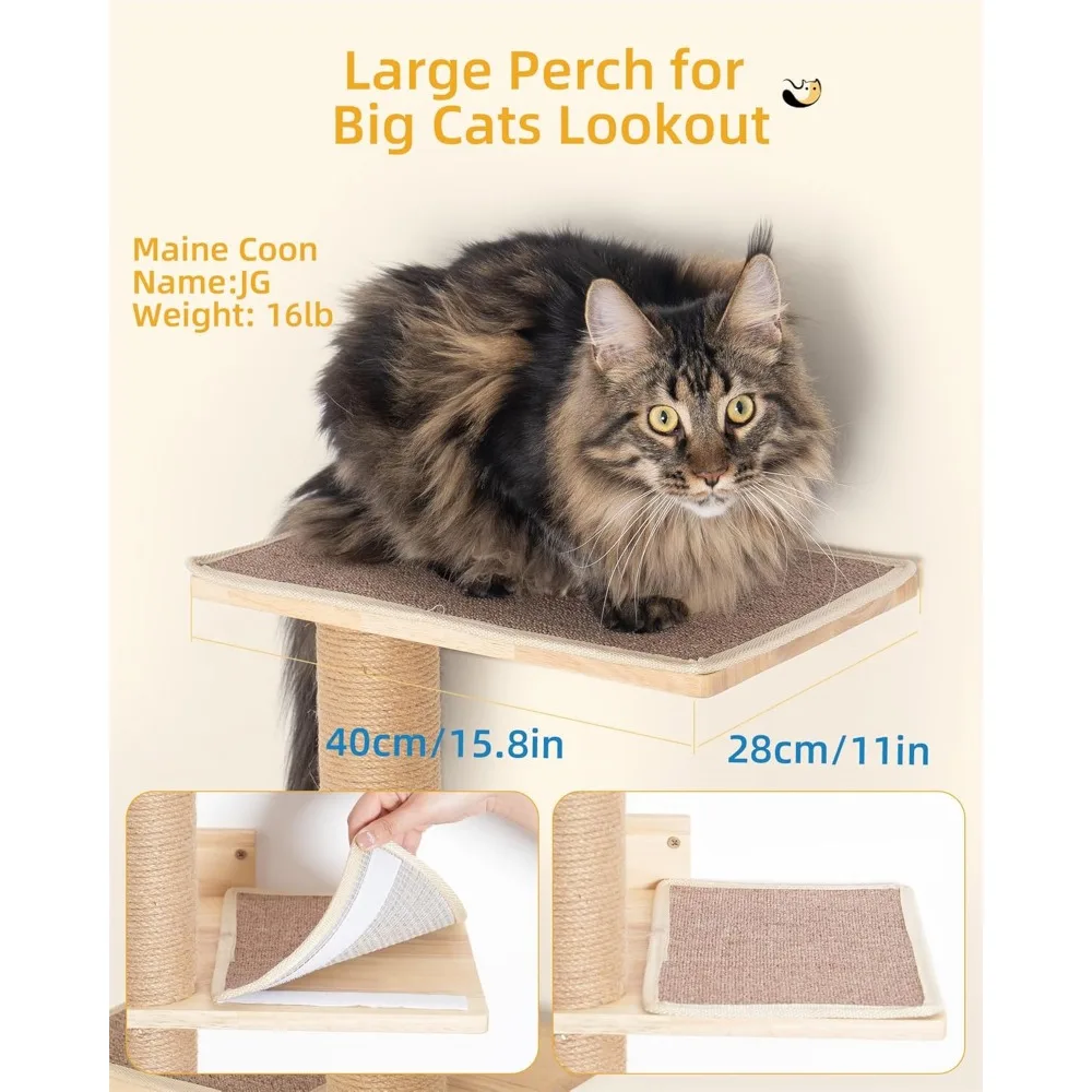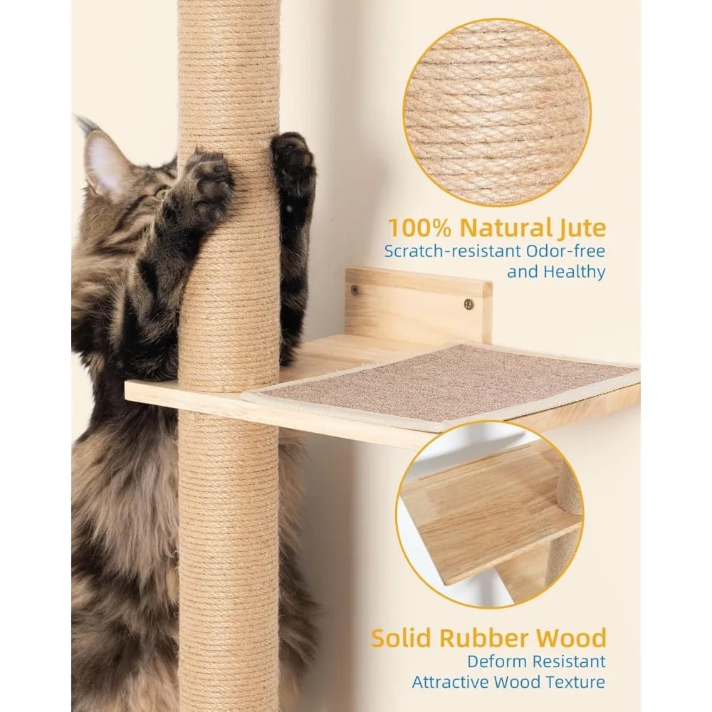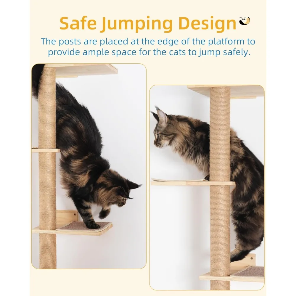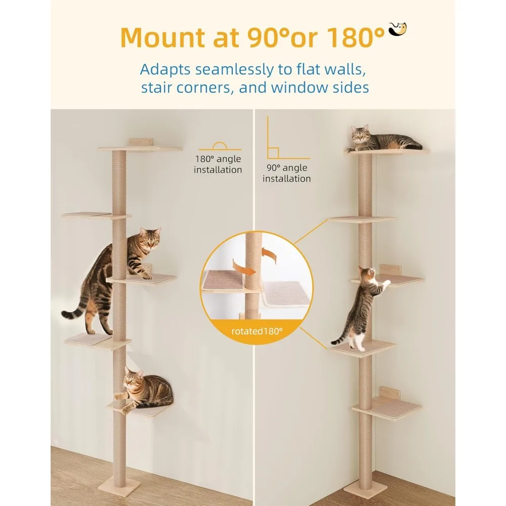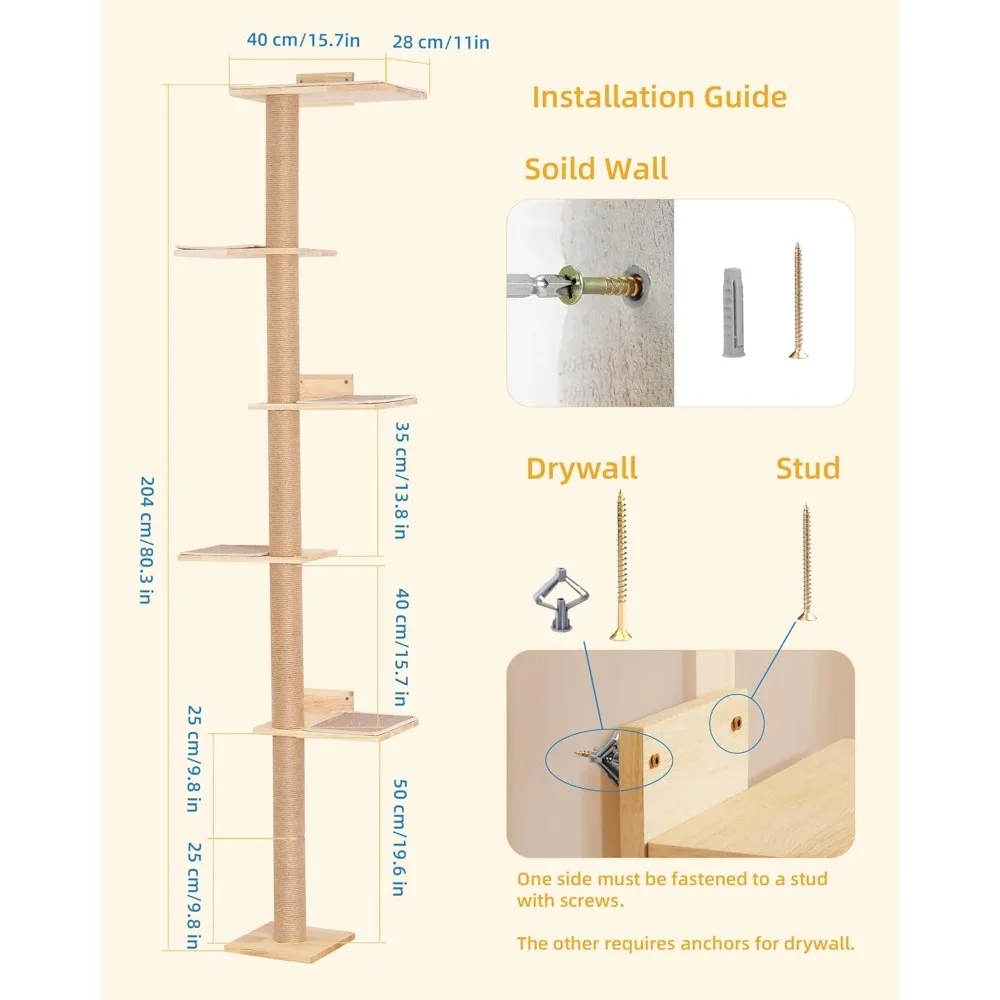 This wall-mounted cat tree is designed to provide a safe and engaging environment for your large adult cats, perfect for homes with limited floor space. Key features include: 1. **Space-Saving Design**: The 80-inch tall structure mounts directly to the wall, extending from floor to ceiling without taking up valuable floor area, ideal for apartments or small rooms. 2. **Comfortable Perch**: Features a 15.8-inch top perch bed that offers a cozy resting spot high above the ground, allowing cats to observe their surroundings comfortably and feel secure. 3. **Adjustable Height**: The tower is fully adjustable to fit various ceiling heights, ensuring a stable and custom fit in any room setup for added safety and versatility. 4. **Multi-Functional Use**: Encourages natural behaviors like scratching, climbing, and lookout activities with durable materials that withstand regular use, promoting exercise and mental stimulation. 5. **Easy Installation**: Comes with all necessary hardware and clear instructions for straightforward assembly, making it quick to set up without professional help. 6. **Durable Construction**: Built from sturdy materials to support large cats up to a certain weight limit (check product specifications), ensuring long-lasting performance and reliability. 7. **Aesthetic Appeal**: Sleek design blends seamlessly with modern home decor while providing functional benefits for your feline friends. This product helps reduce furniture damage by offering designated scratching surfaces and enhances your cat’s well-being through active play and rest areas.