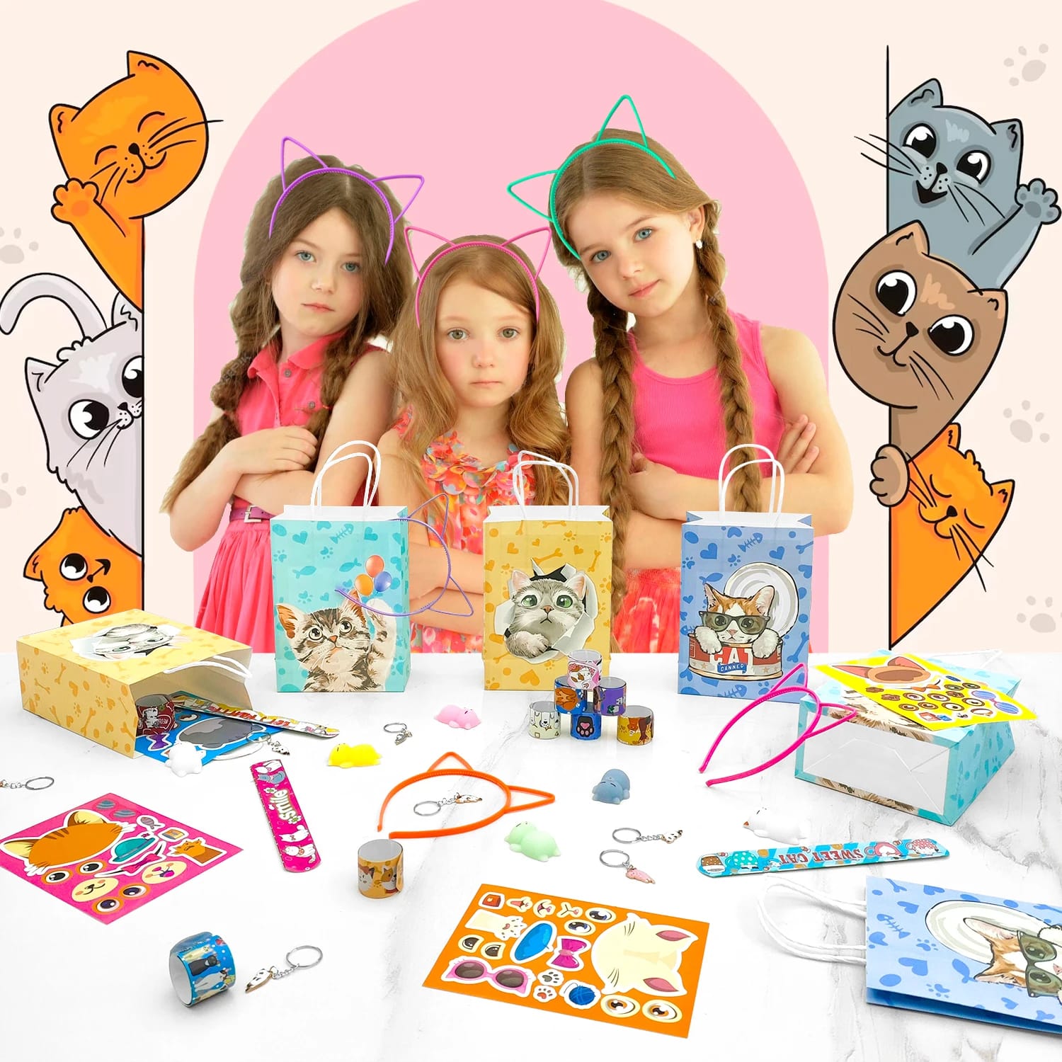 Our cat favors for kids party set includes 12 cat party favor bags, 12 cat ears headband, 12 cat party stickers, 12 cat party keychain, 12 cat party slap bracelets, 12 cat mochi squishy toys etc cat themed birthday party supplies.